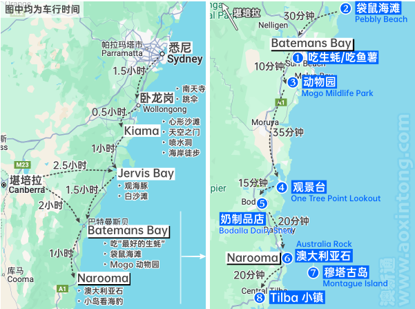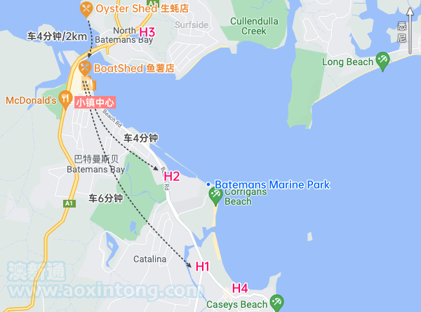 堪培拉- Batemans Bay 约2小时车程;悉尼- Batemans Bay 约4小时车程