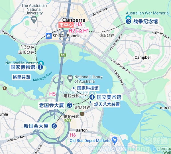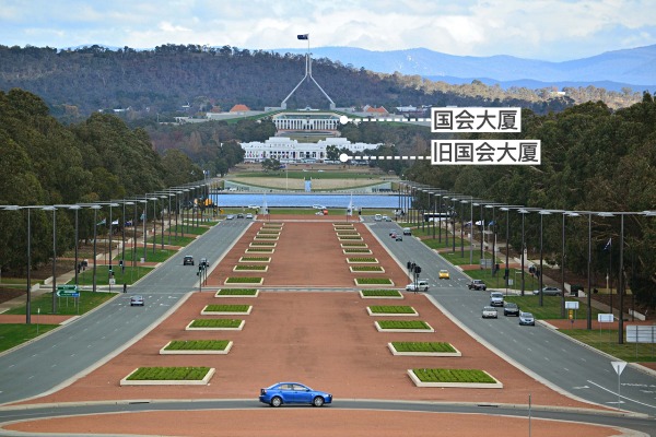 新老国会大厦同位于堪培拉的中轴线上,两者步行10分钟(650米)