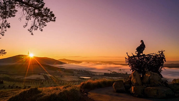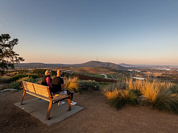 ‣ 看日落/日出:导航 Dairy Farmers Hill lookout,(背靠夕阳)俯瞰堪培拉和欣赏落日余晖下的湖光山色