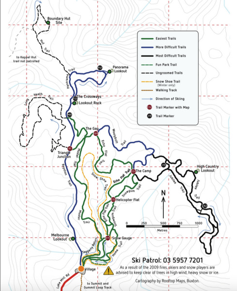 绿道:17%(拥有维州最长绿道,2.2公里);蓝道:60%(“渐进完美”地形);黑道:23%(陡峭雪深树林迷宫)