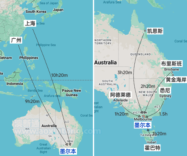 墨尔本,位于澳洲东南海岸,飞行到达时间如下图。