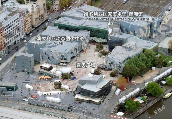 联邦广场:大型露天广场 + 现代风文化建筑群(包括「维多利亚国立美术馆-澳洲馆」和「澳大利亚动态图像中心」)