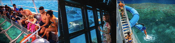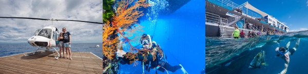 坐船1.5-2小时到达大堡礁平台,浮潜+平台活动,额外可选深潜(即水肺潜水)和10分钟直升机俯瞰大堡礁。
