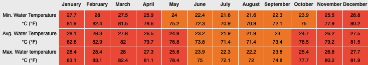 下面表格气温为多年平均水平,实际上,因为全球变暖,现在的实际温度要高好几度(同理水温)。