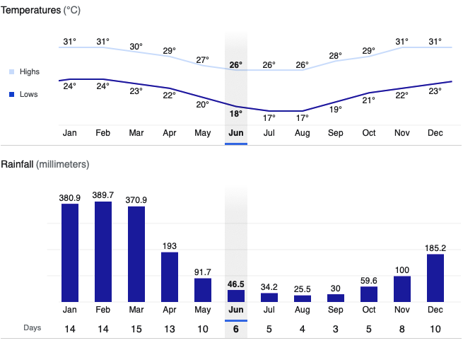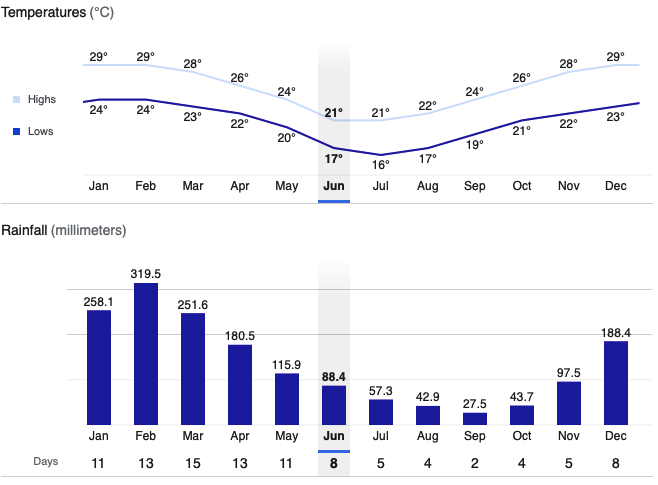 ‣ 艾尔利海滩 / 汉密尔顿岛:南纬20°,全年气温:16°C-29°C,雨季高峰集中在 1-3月