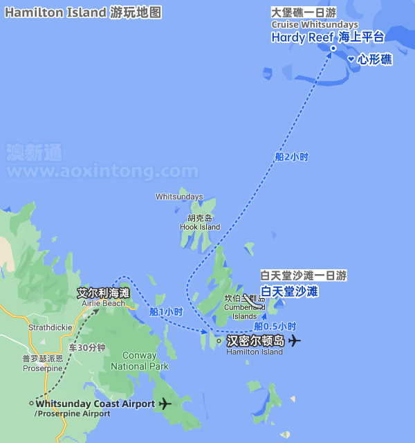 ‣ 只有悉尼,墨尔本,布里斯班和凯恩斯4个城市可直飞 Whitsunday Coast Airport;无国际航班