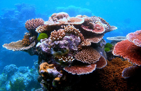 大堡礁有几百种珊瑚,形状千姿百态,有扇形、半球形、鞭形、鹿角形、树木和花朵状等,珊瑚颜色也是绚丽多彩