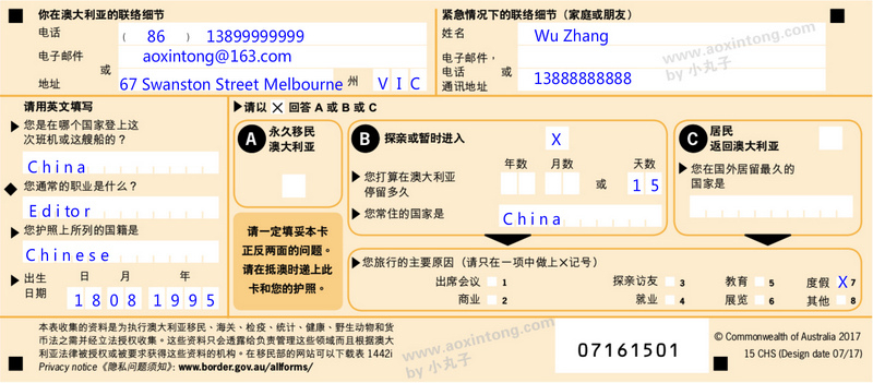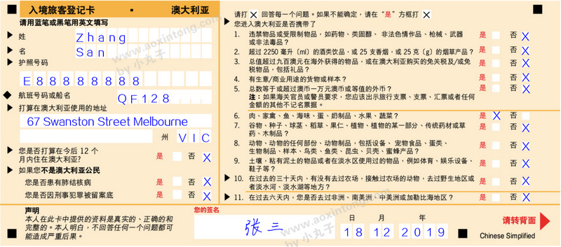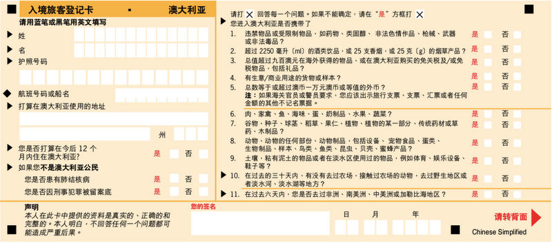 注意: 1. 不管是中文版还是英文版,必须用英文填写 2. 用蓝笔或者黑笔填写 3. 姓和名与护照一致 4. 打算在澳大利亚使用的地址:填写入住澳洲的第一家酒店地址即可 5. 对于携带物品,如实打X;对于不确定是否携带项,建议在“是”后面打X,申报即可。