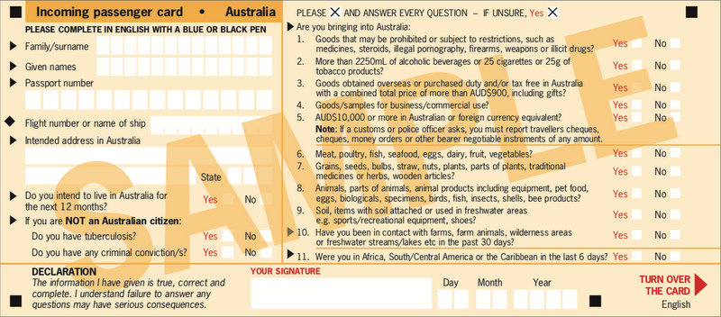 并在入境时,向澳大利亚海关Australian Customs官员出示护照和填好的入境旅客登记卡