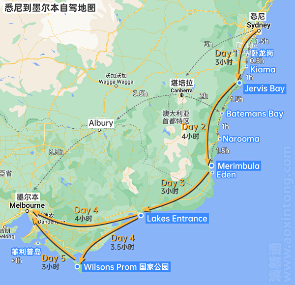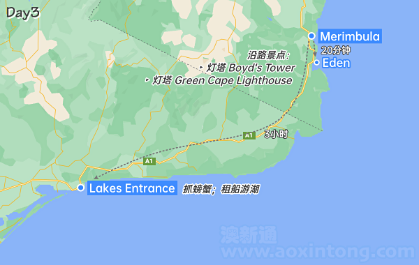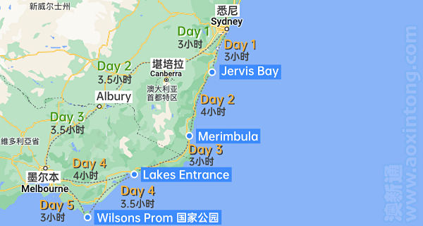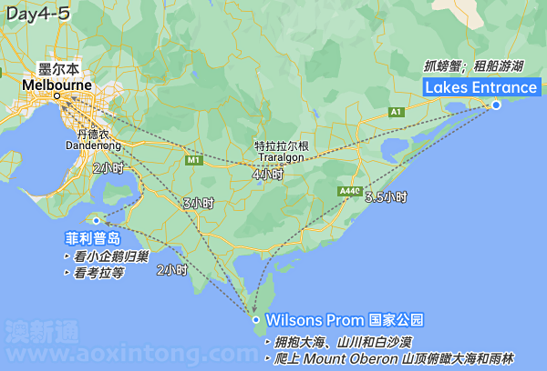 备注:第4天可以结束自驾,从 Lakes Entrance 直接开到墨尔本(320km,车程约4小时)