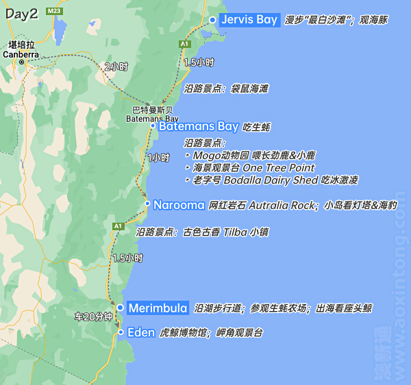 ‣ 然后从堪培拉开到最近的海边小镇 Batemans Bay,车程约2小时(看下面地图)