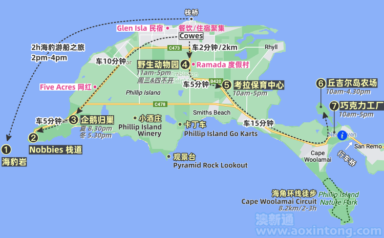 备注:从栈桥出发,沿途可以一路欣赏菲利普岛美丽的海岸线;另外,运气好还能看到海豚