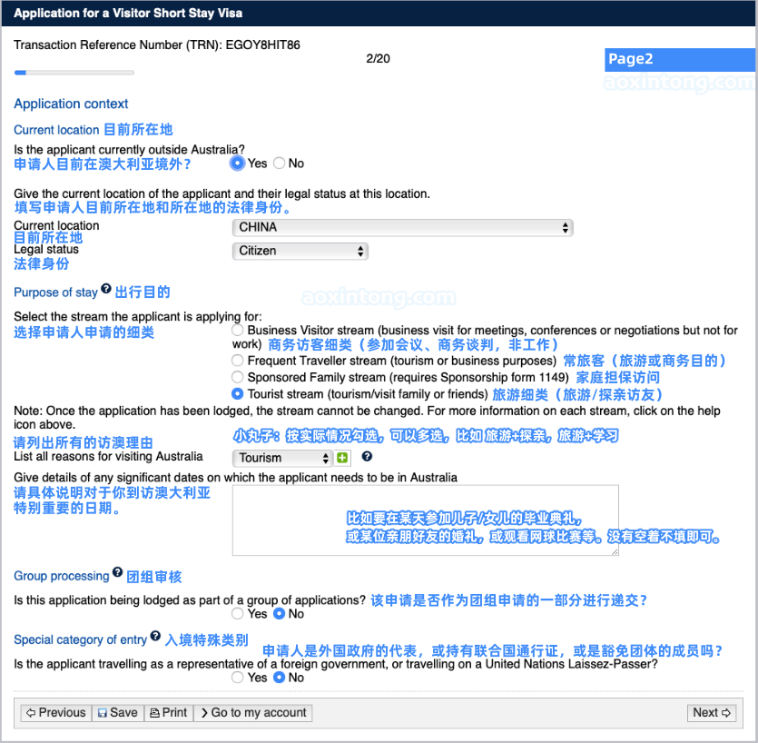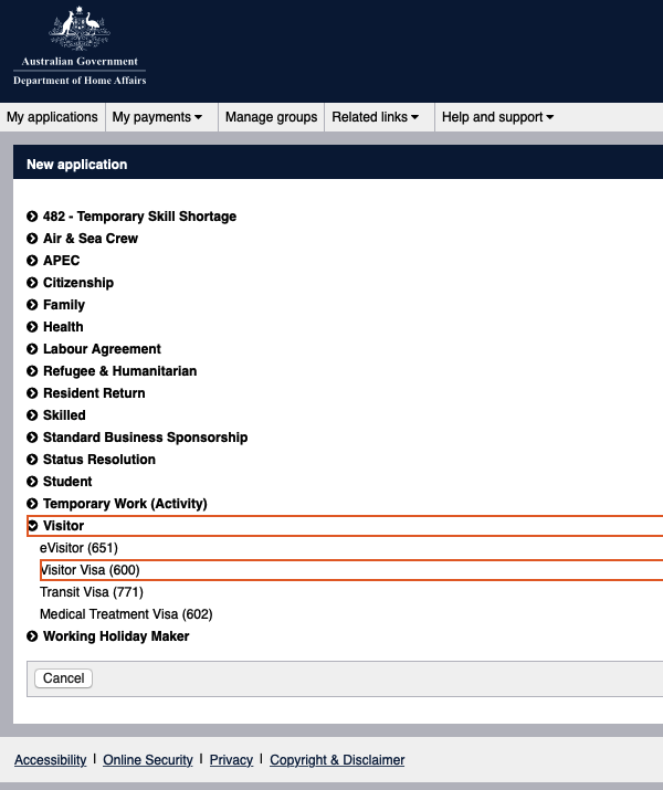 选择Visitor Visa(600)。eVisitor Visa(600)不适用于中国护照持有者,Transit(771)是 澳大利亚过境签证