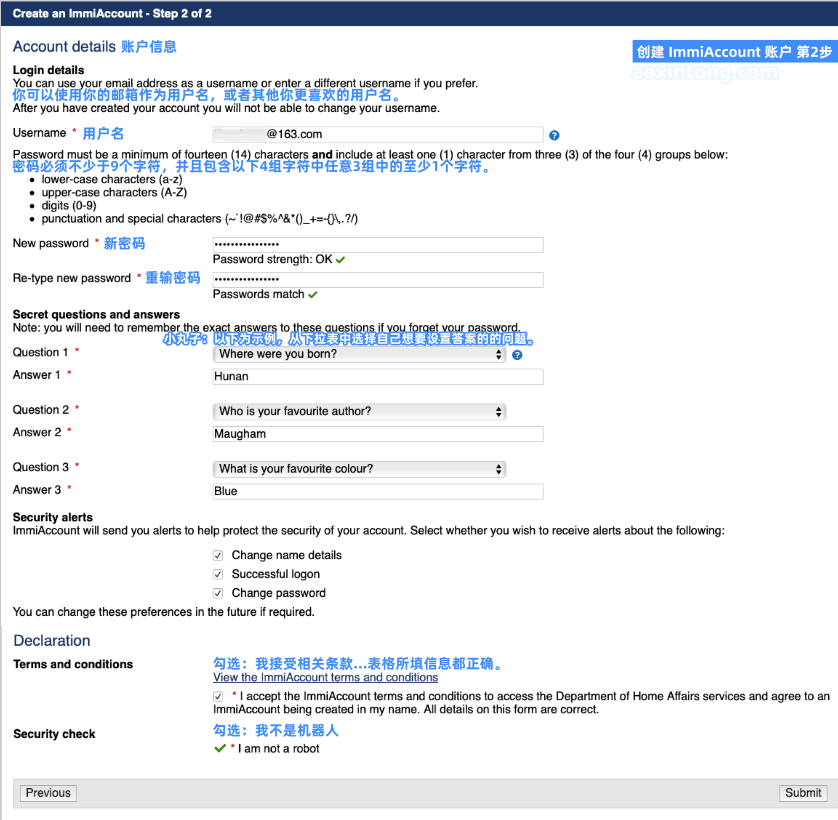 勾选 I am not a robot 我不是机器人后,点击 Submit ,跳出 ImmiAccount 账户成功创建的页面。
