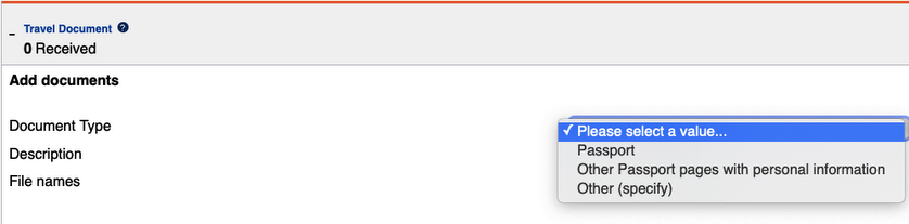 猜测是系统 bug,过往签证和出入境记录可以考虑上传到护照 Travel Document 一栏。