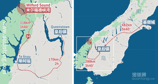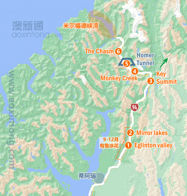 - Homer Tunnel(99km处)荷马隧道为单行通道