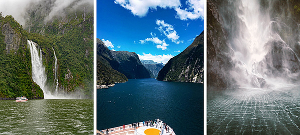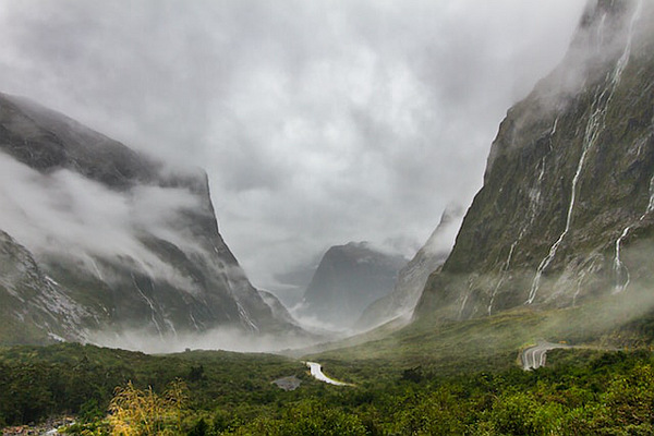 数条瀑布飞舞,从山脉中倾斜而下,直落在米尔福德峡湾中,整个山脉看起来就像活得一样