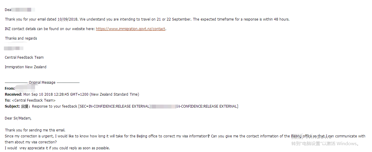 9.10凌晨,5点多的时候,收到新西兰投诉小组的反馈,他们说帮我转到北京办公室处理我的问题了。由于邮件没有写什么时候能够更正,于是我回复了他们的邮件,问他们什么时候能处理好或者是否方便提供北京办公室的联系电话以便我进行沟通。然后很快投诉小组回复了我的邮件,说知道我的情况紧急,会在48小时内处理完毕。然后没到一个小时,立马帮我改正了签注并重新发正确的签注批准信给我了。