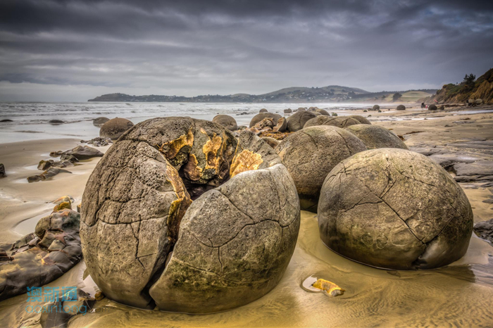 Moeraki Boulders称作莫拉基大圆石,是新西兰奥塔哥海岸莫拉基附近Koekohe海滩上散落的大型球形“石头”。 这些巨石实际上是通过沿海悬崖的海岸线侵蚀暴露出来的。即使在今天,泥岩中仍然存在巨石,最终会因为侵蚀而落入海滩。巨石是南岛上最迷人和最受欢迎的景点之一。它们最初在大约6千万年前开始在古老的海底沉积物中形成,最大的巨石估计需要大约400万年才能达到目前的大小。