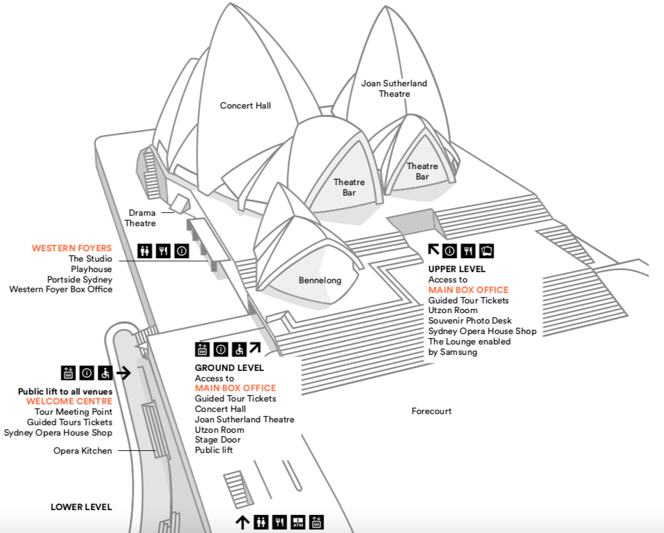 此外还有一个小的多用途场馆Utzon Room以及一个可以调整的室外场馆前院Forecourt。