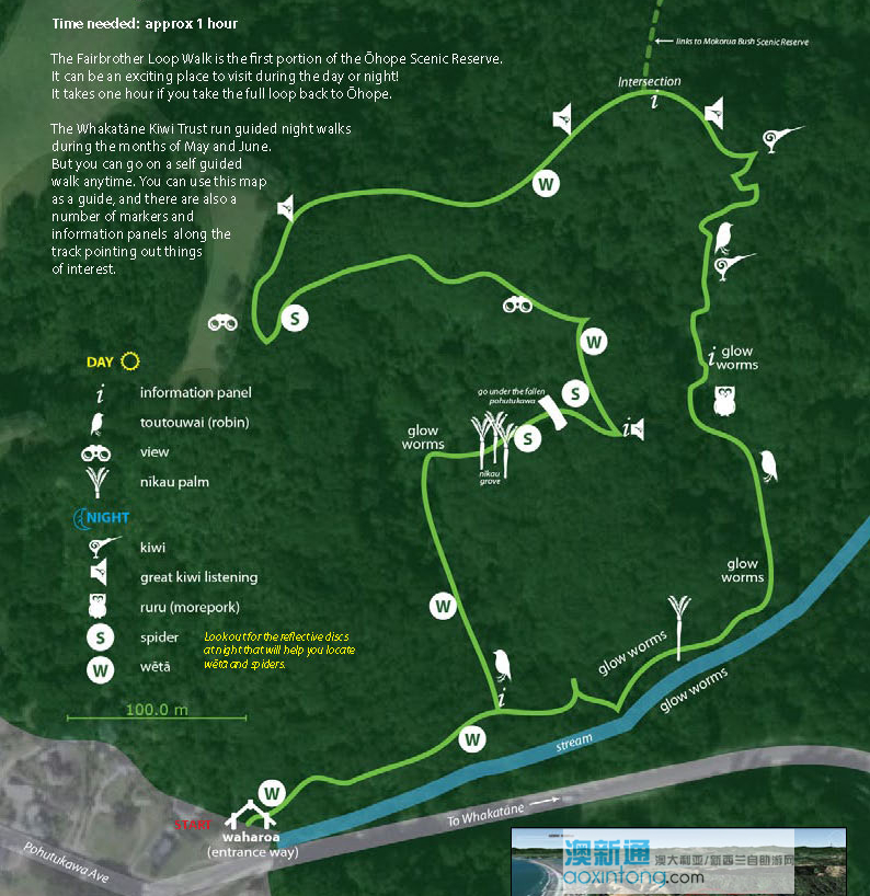 Fairbrother Loop Walk是奥霍普风景保护区的第一部分。在白天或晚上,这是一个令人兴奋的地方!如果你没有时间参加瓦卡塔尼几维鸟信托公司举办的导游带领夜间徒步旅行的话,你可以随时进行自助游。你可以使用以下地图作为指南,沿着步道还有许多标记和信息板提示令人感兴趣的内容。