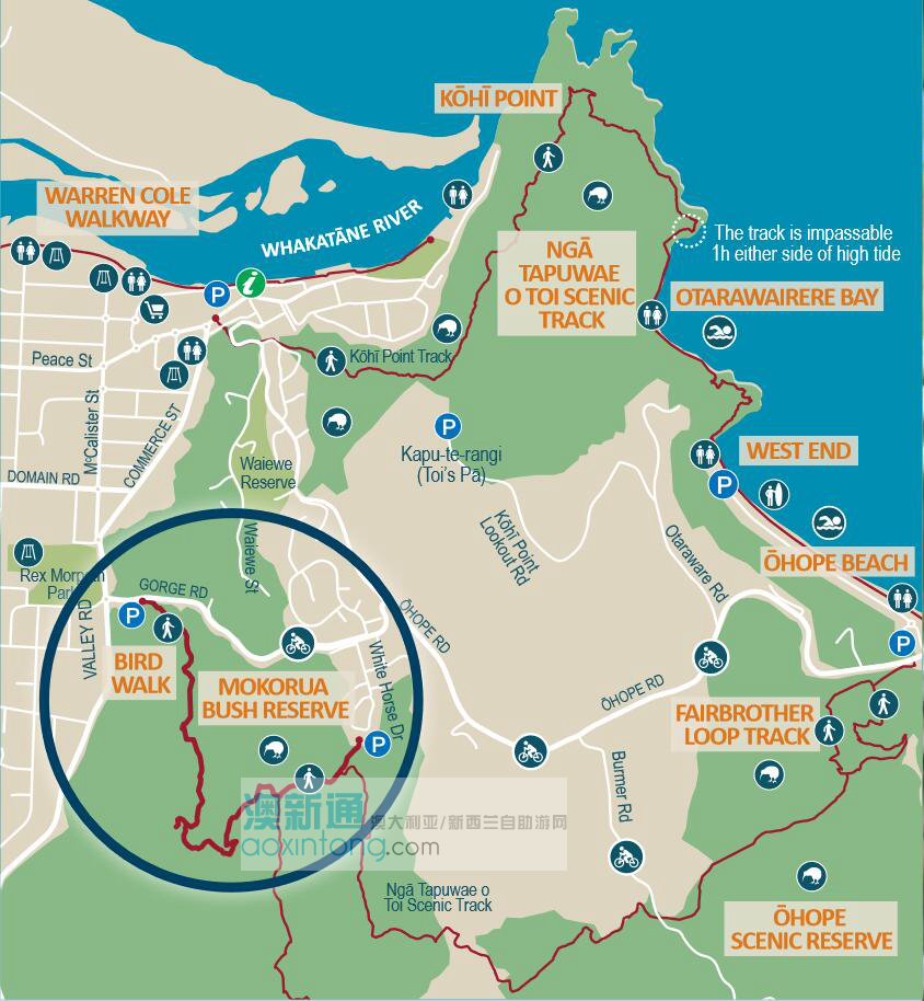 Ngā Tapuwaeo Toi是毛利语,意思是“在Toi的足迹”中。名字的来源是因为它穿越了许多世纪以前伟大Toi酋长的统治之地。他的据点Kapu-te-rangi是新西兰最古老的pā遗迹之一,也是Kohi Point步道中的亮点。俯瞰瓦卡塔尼从白岛火山峰顶延伸到塔拉威拉山(Mt tarawera)全景。这条步道蜿蜒穿过一流的原始森林,壮观的波胡图卡瓦(圣诞树)林,无与伦比的海岸景观和海鸟聚集地。留意蜜雀tūī,铃鸟bellbirds,扇尾鸽fantails和偶有的雷鲁鸟kereru,围绕瓦卡塔尼的灌木和奥霍普充满了鸟鸣和常见的原生灌木鸟。