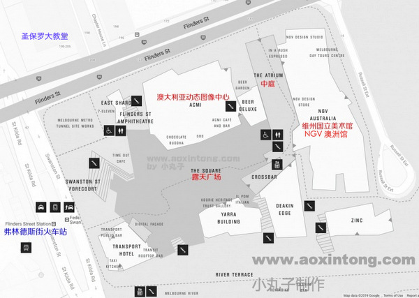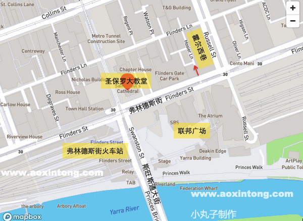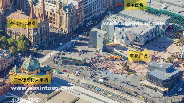 联邦广场/弗林德斯街火车站,南临亚拉河,位于: