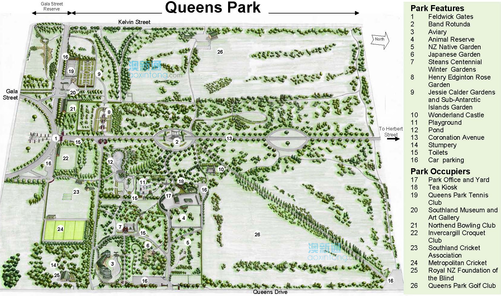 1费尔德威克门,2 亭楼,3鸟舍,4动物保护区,5 新西兰本土花园,6日本花园,7百年冬季花园,8亨利埃德金顿玫瑰园,9 Jessie Calder花园,9亚南极群岛花园,10仙境城堡,11游乐场,12池塘1,13加冕大道,14 St umpery,15卫生间,16停车场,17公园办公室和庭院,18茶亭,19皇后公园网球俱乐部,20南部博物馆和美术馆,21北角保龄球俱乐部,22因弗卡吉尔槌球俱乐部,23南部板球协会,24大都会板球,25新西兰皇家盲人基金会,26皇后公园高尔夫俱乐部