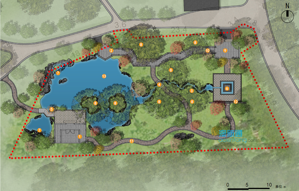 1 临水榭 Waterside Pavilion,2江山亭 Jiangshan Kiosk,3曲水流觞 Winding Water,4平桥 Level Bridge,5 曲桥 Curved Bridge,6友谊之鼎 Bronze Cauldron of Friendship,7假山叠水 Artificial Hill,8保留大树 Arbors Retained,9入口 Entrance,10文化长廊 Cultural Corridor,11镜面水池 Mirror Pool,12 月亮门Moon Gate,13友谊池 Friendship Pool