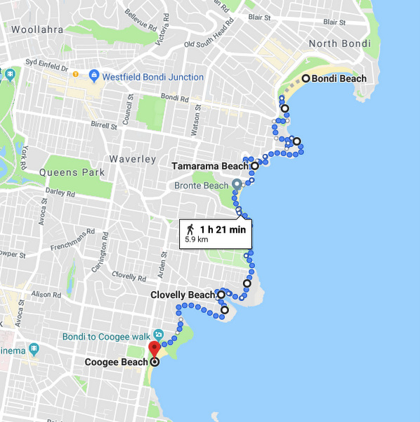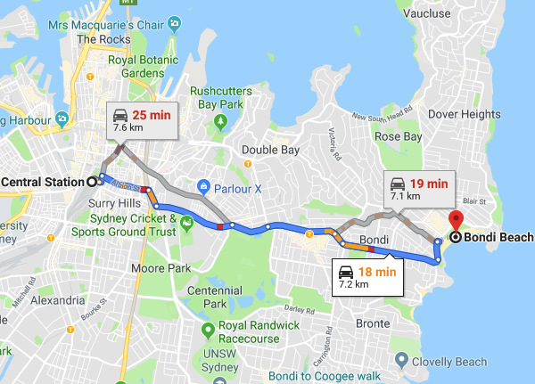 用时:30分钟。中转站Bondi Junction距离海滩只有3公里。