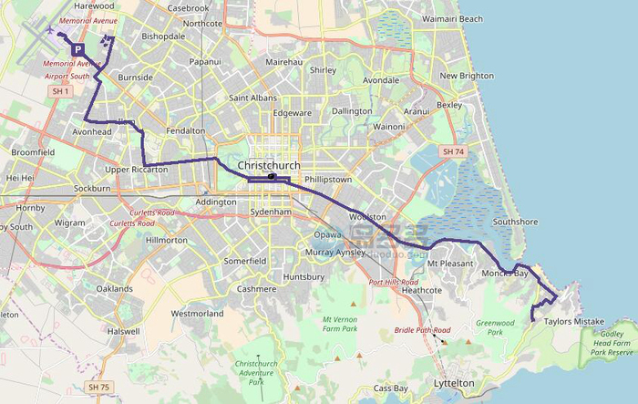 ① P-Purple Line 紫线,基督城机场(每小时内1-2班车从机场发车)—坎特伯雷大学—Westfield Riccarton购物中心—Bus Interchange公交换乘总站 (C站台)—Sumner