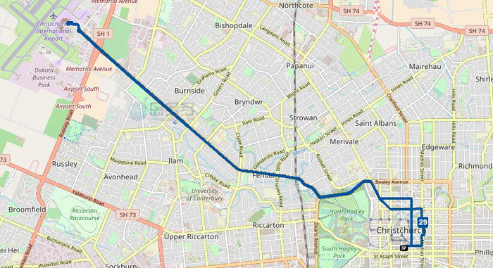 ② 29路,基督城机场—Bus Interchange公交换乘总站 (C站台),每30分钟一趟