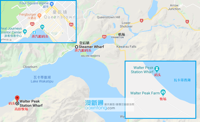 高原牧场是指:瓦尔特峰高原牧场,英文写作Walter Peak High Country Farm。它位于风景如画的瓦卡蒂普湖西南岸(皇后镇在湖的北)。因此从皇后镇出发,要乘船抵达,通常都是乘蒸汽船前往牧场,但因每年有一个月的时间是蒸汽船维修时间,所以在此期间会由现代船只代替在瓦卡蒂普湖上的航程。同时在这期间费用也会有优惠。