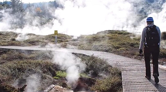 沿主步道行走,观赏周围如球表面般的凹凸地貌和沸腾的温泉