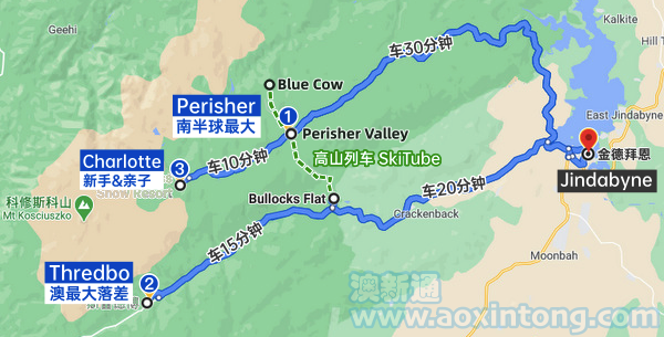 Perisher Valley:位于缆车 lift base,酒店价格贵,好处滑雪方便