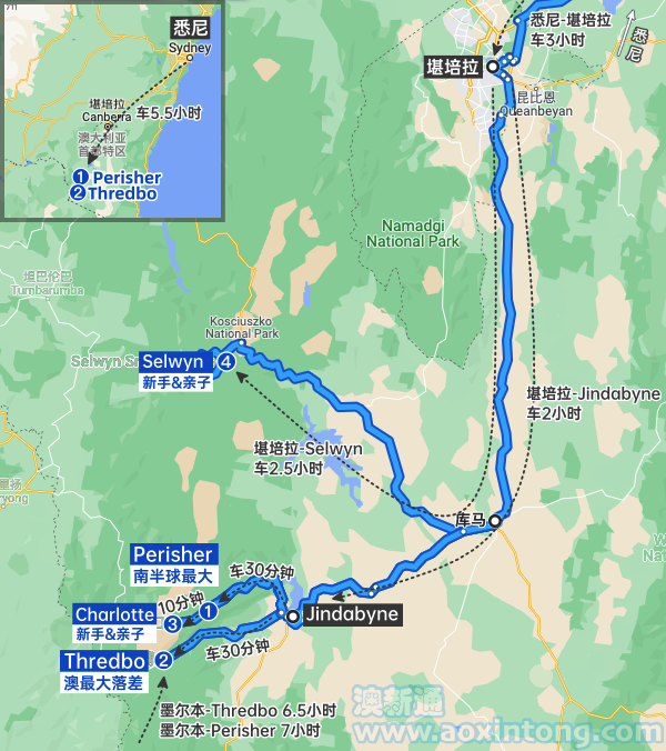 悉尼出发,大多数人会选择去大雪场:Perisher 和 Thredbo,住2-5晚(发烧友更长),推荐住在