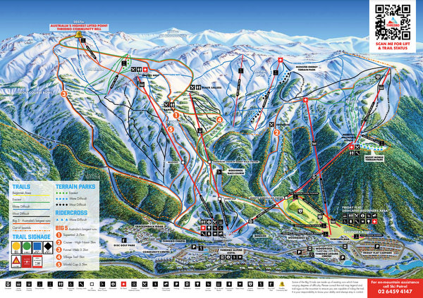 缆车最高海拔2037米(澳洲最高),滑道落差大,高山风光好。可滑雪带480公顷,共14条缆车。