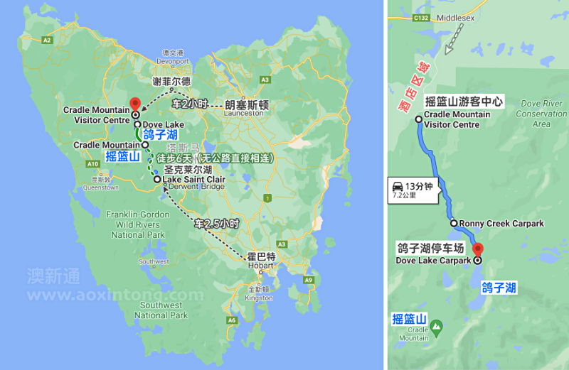 开到 Ronny Creek Carpark 或 Dove Lake Carpark(相距车程4分钟/约2km,Dove Lake Carpark 是车能开到的最远位置)