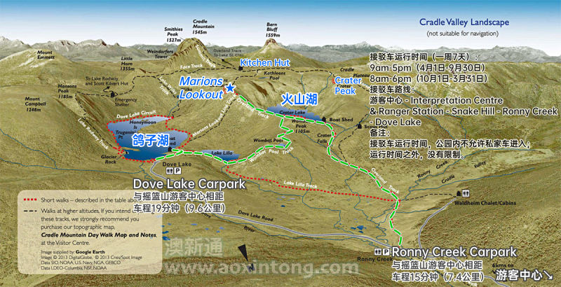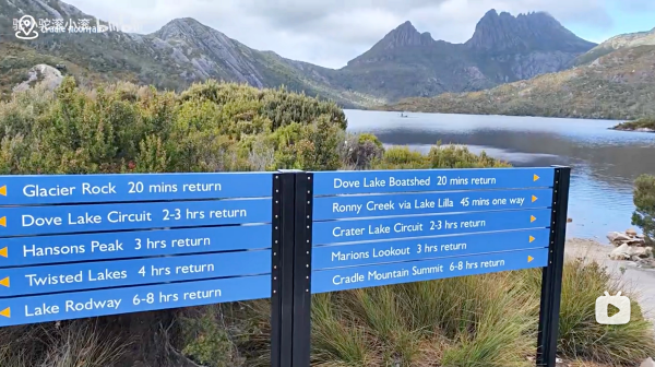 备注:注意末班车5/6pm;如果体力有限,也可以在火山湖就下撤;若体力不错,从 Marions Lookout 可以继续往前到 Kitchen Hut(小木屋庇护所),近看摇篮山山峰,再往 Crater Peak(火山湖东北侧观景点)下山